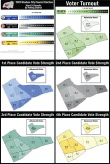 ![]() Map showing the winning candidate's vote strength in each of the 10 wards and their respective polling districts. The districts shaded in Blue voted a majority for Drew Dilkens, and Yellow voted a majority for Chris Holt. The darker the shade, the higher the candidate's total vote share in that specific polling district.