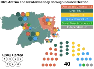 ![]() Antrim and Newtownabbey 2023 Council Election Results by DEA (Shaded by the plurality of FPVs) | |||||||||||||||||||||||||||||||||||||||||||||||||||||||||||||||||||||||||||||