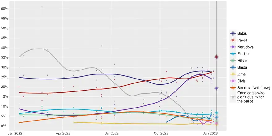 The first round took place on 13 and 14 January. Petr Pavel, former chair of the NATO Military Committee, ran as an independent on a pro-Western, pro-European platform,[1] and was one of three candidates backed by the centre-right governing alliance Spolu.[2] He won the first round of the election with 35.40% of the popular vote, ahead of Andrej Babiš, the former Czech prime minister running as the candidate of ANO 2011, who finished second with 34.99%.[3] Babiš had expressed opposition to Czech support for Ukraine after the Russian invasion and was characterised in the media as using populist rhetoric.[4][5] For the runoff, Pavel was backed by most eliminated candidates and by the incumbent prime minister Petr Fiala, while Babiš received an endorsement from the Communist Party of Bohemia and Moravia[6] and the outgoing president Zeman.[7]