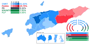 Voter turnout fell slightly to 79.3% from 80.98% in 2018, though it has to be noted that the number of registered voters and overall total votes cast rose from 2018 due to the country's growing population.[51] President Ramos-Horta said he would invite the strongest party (the CNRT) to talks on forming a government. Again, Ramos-Horta stressed that he would not accept any coalition partner.[52] The provisional result showed a clear victory for the CNRT, which resulted in a likely majority in the National Parliament together with the PD. The platform of the old ruling parties, Fretilin, KHUNTO and PLP, will probably only get 28 of the 65 seats, less than the CNRT alone, thus failed to unite the majority of seats. The Greens narrowly failed to clear the four-percent hurdle, followed by the PUDD. All other parties got less than one per cent of the vote each. The Fretilin was only the strongest party in its strongholds of Lautém, Viqueque and Baucau. Otherwise, the CNRT was always ahead, even in polling stations abroad. In the municipality of Ermera, the CNRT even received an absolute majority of 51.05% of the votes. This is the worst result ever for Fretilin.[51][53]