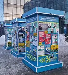 There were 283 candidates chosen from all seven participating parties within electoral lists, as well as 609 candidates nominated in all single-member districts in which overwhelmingly 525 were self-nominees (independents) whilst 79 candidates from seven political parties and 5 candidates from four public associations.[123] The average number of nominated contestants in each constituency was 21 with the most being in Electoral district No. 1 and No. 2 of Astana (63 candidates each) and the least in No. 28 of Ulytau Region (6 candidates).[124]