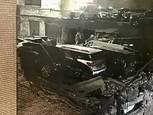 Moore's body was retrieved the day after the collapse.[12][14] Following the collapse, the building was scheduled to be razed via controlled demolition.[28][29][27] Although some sources said there had been between 80 and 90 vehicles in the garage just before it collapsed,[27][30] the FDNY estimated that there had been about 40 cars in the building.[14] On April 20, cranes began demolishing the remains of the garage.[27] Also to be demolished was a connected parking garage at 25 Beekman Street.[2] Demolition was temporarily delayed due to concerns that the work would trigger a secondary collapse.[29] The rear of the garage partially collapsed on April 29, 2023, while it was being demolished.[31]