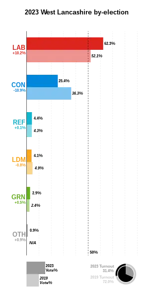 - 1 2 Lovelady, Amy; Thorp, Liam; Haygarth, Dan (10 February 2023). "Live: West Lancashire by-election, polls, results and reaction". Liverpool Echo. Retrieved 10 February 2023.