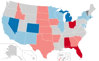 ![]() Democratic incumbent Democratic incumbent term-limited Republican incumbent Republican incumbent term-limited Nonpartisan incumbent No election Incumbent TBD | ||||||||||
