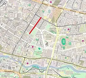Located in downtown district, the street unfolds on an approximate south–north axis, parallel to Gdańska street on the west and Staszica and Paderewskiego Streets on the east. The southern tip of the street (odd numbers till 9) faces the agreeable Jan Kochanowski Park.