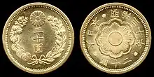 New coinage reform was adopted on March 26, 1897 which re-established the gold 20 yen coin. These new standards lowered both the size and weight of the coin, the new diameter was set at 28.78mm (previously 35.06mm), and the weight was lowered from 33.3g down to 16.6g.[4][5] Over 1.5 million coins were struck during this year before production ceased until 1904.[lower-alpha 1] Coinage of 20 yen pieces then continued past the reign of Emperor Meiji, into the reign of Emperor Taishō where coinage stopped in 1920. The decision to stop minting 20 yen pieces came as Japan's gold reserves were quickly depleted from excess imports.[7] These reserves were eventually stabilized and coinage started again in 1930. By this time though, the gold coins minted were described as "not in general use".[8]