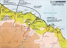 At Rabaul, the brigade came under operational control of the 8th Area Army and it was subsequently tasked with reinforcing Japanese troops in the BunaGona area, in New Guinea. After leaving their horses in Rabaul,[8] the movement was undertaken aboard several destroyers, and was carried out over the course of several trips in late November and early December, which were severely disrupted by Allied air attack. Some elements of the brigade were lost during the reinforcement movement including the barge carrying the 170th Infantry Regiment's commander and its regimental flag.[10] Consequently, the brigade's troops were scattered over several areas (the Mambare River, the Kumusi, Giruwa), before concentrating around Napapo, to the west of Gona.[11][12]