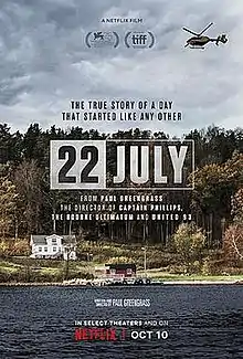 22 July is a 2018 American crime drama film about the 2011 Norway attacks and their aftermath, based on the book One of Us: The Story of a Massacre in Norway — and Its Aftermath by Åsne Seierstad.[4][5][6] The film was written, directed and produced by Paul Greengrass and features a Norwegian cast and crew. It stars Anders Danielsen Lie, Jon Øigarden, Thorbjørn Harr, Jonas Strand Gravli, Ola G. Furuseth, Ulrikke Hansen Døvigen, Isak Bakli Aglen, Maria Bock, and Seda Witt. The film had its world premiere on September 5, 2018, in the main competition section of the 75th Venice International Film Festival.[7][8][9] and was released online and in select theaters on October 10, 2018, by Netflix.[10][11]