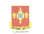 - Symbolism: The shield is red for Artillery. A white cross patée was the badge of the 2d Division, 5th Corps, and a white disk the badge of the 2d Division, 1st Corps, of the Army of the Potomac during the Civil War. The disk has been made blue for contrast, conforming to the heraldic law of not placing metal on metal, and to produce the color combination white and blue, symbolizing the service as Infantry. The sheathed Roman sword, taken from the Spanish War service medal, denotes that the organization served within the continental limits of the United States during the Spanish–American War. The fleurs-de-lis represent the service of the 1st Trench Mortar regiment and the 57th Artillery, Coast Artillery Corps, in France during World War I, which were formed from component parts of the regiment. The number “9” was used by the regiment from the time of its organization in 1859 until 1924. The motto translates to “By Reason Or By Force.”