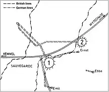 In November 1915, 250th Tunnelling Company began work on the deep mine at Hollandscheschur Farm as it sank a shaft to some 20 metres (66 ft) and then drove a tunnel over 250 metres (820 ft) extending well behind the German lines. Despite counter-mining by German units, three charges were eventually placed and fired. The mine consisted of three chambers (Hollandscheschur Farm 1, 2, 3) with a shared gallery. It was placed around the German strongpoint Günther between Wijtschate and Voormezele, not far from the Bayernwald trenches in Croonaert Wood. The logic behind the exact placing of the charges at Hollandscheschur Farm was to take out a small German salient (strongpoint Günther) that protruded into the British lines.[9][10]