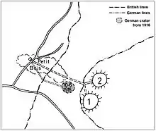 As part of the prelude to the Battle of Messines, deep-level mine galleries were dug by the British 171st, 175th and 250th Tunnelling companies and the 1st Canadian, 3rd Canadian and 1st Australian Tunnelling companies, while the British 183rd, 2nd Canadian and 2nd Australian Tunnelling companies built dugouts (underground shelters) in the Second Army area.[8] 250th Tunnelling Company's role prior to the Battle of Messines was to dig the mines at Petit Bois, Peckham and Spanbroekmolen under the Messines ridge.[1] The mines at Messines were detonated on 7 June 1917, creating 19 large craters.