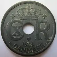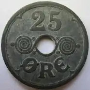 The 25 øre coin was minted between 1941 and 1945 during the German occupation of Denmark. They were made entirely of zinc, which was a cheap metal commonly used in the German-held territories for occupation currency.