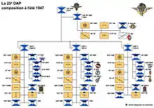 Following the end of World War II, France planned to create two Airborne Divisions, organized similarly to United States airborne formations. The first to be created, the 24th Airborne Division, was dissolved after only three months due to a chronic lack of troops. The infantry of the 24th DAP and its 24th CEP were transferred to the 25th Motorized Infantry Division, which was used to form the 25th Airborne Division on February 1, 1946. The new division was formed in southwest France with its headquarters at Bayonne.[1]