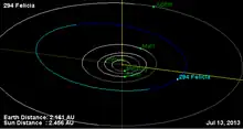 Felicia (minor planet designation: 294 Felicia) is a sizeable Main belt asteroid. It is approximately 35 km in diameter and has an orbital period of 5.5 years.[2] It was discovered by Auguste Charlois on 15 July 1890 in Nice.