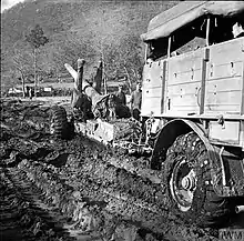 In February 1944, 2nd AGRA was sent with three field and five medium regiments to support the New Zealand Corps in operations against Monte Cassino.[10][15] By late May, 2nd AGRA was supporting X Corps' advance after Operation Diadem had broken through the German Winter Line, and in the subsequent pursuit to Lake Trasimeno and advance to Florence, with the following order of battle:[10][16][17]