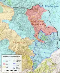 The First Nagorno-Karabakh War resulted in the displacement of approximately 725,000 Azerbaijanis and 300,000–500,000 Armenians from both Azerbaijan and Armenia.[141] The 1994 Bishkek Protocol brought the fighting to an end and resulted in significant Armenian territorial gains: in addition to controlling most of Nagorno-Karabakh, the Republic of Artsakh also occupied the surrounding Azerbaijani-populated districts of Agdam, Jabrayil, Fuzuli, Kalbajar, Qubadli, Lachin and Zangilan.[142] The terms of the Bishkek agreement produced a frozen conflict,[143] and long-standing international mediation attempts to create a peace process were initiated by the OSCE Minsk Group in 1994, with the interrupted Madrid Principles being the most recent iteration prior to the 2020 war.[144][145] The United Nations Security Council adopted four resolutions in 1993 calling for the withdrawal of "occupying forces" from the territories surrounding Nagorno-Karabakh,[146] and in 2008 the General Assembly adopted a resolution demanding the immediate withdrawal of Armenian occupying forces,[147] although the co-chairs of the OSCE Minsk Group, Russia, France and USA, voted against it.[148]