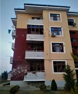 The ceasefire quickly broke down and the Azerbaijani advance continued. Within days Azerbaijan announced the capture of dozens of villages on the southern front.[173] A second ceasefire attempt midnight 17 October 2020 was also ignored.[174] Azerbaijan announced the capture of Jabrayil on 9 October 2020 and Füzuli on 17 October 2020. Azerbaijani troops also captured the Khoda Afarin Dam and Khodaafarin Bridges. Azerbaijan announced that the border area with Iran was fully secured with the capture of Agbend on 22 October 2020.[175] Azerbaijani forces then turned northwest, advancing towards the Lachin corridor, the sole highway between Armenia and Nagorno-Karabakh, putting it within artillery range. According to Artsakh, a counterattack repelled forward elements of the Azerbaijani force and pushed them back. Armenian/Artsakh resistance had managed to halt the Azerbaijani advance to within 25 kilometres of the Lachin corridor by 26 October 2020. Artsakh troops who had retreated into the mountains and forests began launching small-unit attacks against exposed Azerbaijani infantry and armour, and Armenian forces launched a counteroffensive near the far southwestern border between Armenia and Azerbaijan.[176] On 26 October 2020, a US-brokered ceasefire came into effect, but fighting resumed within minutes.[177][178] Three days later, the Artsakh authorities stated that the Azerbaijani forces were 5 km (3.1 mi) from Shusha.[179] On 8 November 2020, Azerbaijani forces seized Shusha,[180] the second-largest city in Artsakh before the war, located 15 kilometres from Stepanakert, the republic's capital.[181]