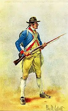Today, the 2nd New Hampshire/8th Continental Regiment is recreated by a group of living historians dedicated to portraying this illustrious unit as authentically as possible. The group portrays one company of the regiment through its various uniforms and equipage over the course of the American Revolution, from the civilian hunting fowlers and "small clothes" of the militia to the distinctive uniform and Charleville muskets of the light infantry in 1781. The unit portrayed was originally a militia company commanded by Captain Jonathan Wentworth in what is now Dover and Rollinsford in Strafford County, New Hampshire. Capt. Wentworth was court martialed and cashiered in July 1776 for dereliction of duty, though he claimed it was because he was lacking a tent and still recovering from "small pox and camp distemper".[3] Though Wentworth was exonerated and returned to the army a few years later, in 1776 command of the company passed to Lieutenant James Carr. He became paymaster in 1779, and Samuel Cherry, originally a native of Ireland, became company commander and led the soldiers during their greatest moment at Yorktown when they stormed the British lines.