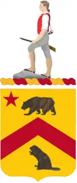 The 301st's coat of arms was approved on 16 June 1924 and its distinctive unit insignia on 18 June 1925. The distinctive unit insignia included a 1 1/8 in (2.86 cm) gold colored metal and enamel device, which consisted of a yellow shield with a red chevron in the center, a red star to the left of a walking grizzly bear in the upper left corner, and a beaver below the chevron. The shield's color symbolized the cavalry, the red chevron represented its artillery service, the bear and red star were from the Seal of California, where the 301st was originally formed, and the beaver was from the Seal of New Netherland, representing its location in New York. The regimental motto, "Fort Et Loyal" (Strong and Loyal), was attached to the bottom of the distinctive unit insignia. The regimental coat of arms was of a similar design to the distinctive unit insignia but included the Organized Reserve's Minuteman crest above the shield and omitted the motto.[6]