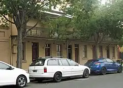 A simple two storey Victorian terrace house with two bedrooms. Features include a cantilevered balcony over footpath, a corrugated iron verandah, a french door on upper storey, panelled front door with fanlight and a sash window with slab sill on ground floor. Storeys: Two; Construction: Painted brickwork, corrugated galvanised iron roof. Timber framed cantilevered balcony with cast iron columns and decorative iron lace. Style: Victorian Filigree.[1]