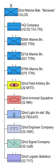 The 32nd Marines Brigade (Greek: 32 ΤΑΞ ΠΝ - 32η Ταξιαρχία Πεζοναυτών Mοράβας, romanized: 32 TAX PN - 32 Taxiarhia Pezonavton Moravas) is the marines unit of Hellenic Republic. The brigade is based at the port town of Volos in Thessaly, and its primary role is infantry and amphibious operations on the numerous islands off the Greek coast. Unlike other countries, the Greek Marines form part of the Army, while the landing craft and naval equipment are provided by the Hellenic Navy.