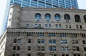 The facade is made of limestone and sandstone, which serve as cladding for the steel interior superstructure. It is separated horizontally into three sections: a two-story base, seven-story midsection, and five-story top section.[23][24] The stones of the facade are rusticated, with deep horizontal and vertical grooves separating each block.[4][2] The far eastern end of the building is topped by a round tower.[25]