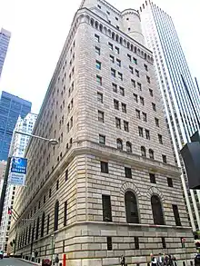The Federal Reserve Building is where the monetary policy of the United States is executed by trading United States dollars and United States Treasury securities.[11] The original 1924 building and its 1935 annex were both designed for the Federal Reserve Bank of New York by York and Sawyer in the neo-Renaissance style.[4][12] Marc Eidlitz & Son was the main contractor for both structures.[13][12] Numerous other engineers and contractors were involved in the building's construction.[12][lower-alpha 1]