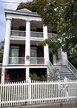 364 Van Duzer Street is a 2+1⁄2-story, clapboard-covered frame house with a gable roof. It features a tetrastyle portico with 2-story, Doric order columns rising to an overhanging spring-eave, unusual on a Greek Revival house and more characteristic of Dutch Colonial architecture. This hybrid style is indigenous to Staten Island. The house was built in 1835 by Robert M. Hazard, captain of the Nautilus, a ferryboat owned by Daniel Tompkins, as well as postmaster of Tompkinsville.[2]