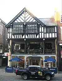 The building is in three storeys and is constructed in yellow sandstone and brick with stone dressings. The top storey is timber-framed. A modern shop front has been inserted into the lowest storey. The middle storey, which incorporates a section of the Rows, has a timber balustrade, behind which is the walkway, and then another shop front. The top storey is jettied. On the face overlooking Bridge Street are two six-light oriel windows under a gable, and a smaller three-light casement window to the right. On the south side, overlooking Pierpoint Lane, are small windows in both the middle and the upper storeys.[1] Douglas' biographer Edward Hubbard considers it is one of his "most heavily decorated half-timber works".[2]