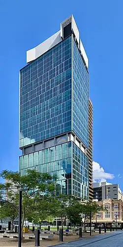 The building was designed by architects COX Architecture (Cox Rayner). The total cost of the building's construction was $270 million and it provides 43 000 m2 of floor area.[1] The main contractor was Thiess.[2] Foyer artwork was curated by Jacqueline Armitstead (Armitstead ART Consulting) with three integrated artworks undertaken by Donna Marcus, Gemma Smith and Kenji Uranishi, commissioned in accordance with Brisbane City Council's Art for Public Places policy. The project was awarded an AIA (Queensland Chapter) Commercial Architecture Brisbane Commendation 2010 • AIA (Queensland Chapter) Art and Architecture Brisbane Commendation 2010