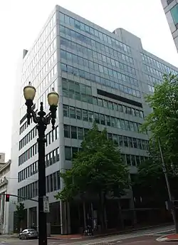 First National Bank of Oregon announced it would build a new headquarters building in 1957,[1] with the contract to build the structure going to Hoffman Construction Company.[2] The planned $3.5 million, five-story building was designed by Stanton, Boles, Maguire & Church and was to have 100,000 square feet (9,300 m2) of space.[2] The building was to be on the site of the Century Theater and Lafayette Building, and would also require the demolition of part of the bank's existing headquarters.[1][2]