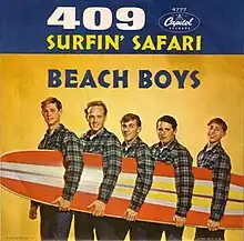 "409" is a song written by Brian Wilson, Mike Love, and Gary Usher for the American rock and roll band the Beach Boys. The song features Love singing lead vocals. It was originally released as the B-side of the single "Surfin' Safari" (1962).[3] It was later released on their 1962 album Surfin' Safari, and appeared again on their 1963 album Little Deuce Coupe.
