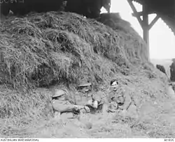 After the German offensive was blunted, a lull period followed during which the Allies slowly sought to gain the initiative, undertaking several "Peaceful Penetration" operations. In July, the 44th took part in the Battle of Hamel, assigned the task of flanking the village to the north and south in support of the 43rd Battalion.[10] In August, the 44th joined the Allied Hundred Days Offensive after which it took part in several attacks against the Hindenburg Line in the final months of the war. Its final battle came in early October 1918, at the Battle of the St Quentin Canal. By the time it was withdrawn for rest, it was down to just 80 men and it did not return to the line before the war came to an end in November 1918; total casualties during the war amounted to 437 killed and 1,346 wounded.[1] A total of nine drafts of reinforcements were sent to the battalion between June 1916 and July 1917.[4] The 44th Battalion received 15 battle honours for its involvement in the fighting on the Western Front; these were bestowed in 1927.[11]