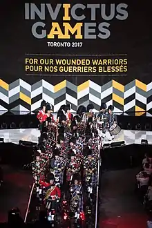 In its first year, the band was organized with a total strength of 14 pipers and 5 drummers combined. During World War I, the pipe band accompanied the regiment to Europe where it led it into battle.[3] The pipes and drums have played at every Toronto Maple Leafs home opening game at both Maple Leaf Gardens and the Air Canada Centre since their performance at the opening of the new Maple Leaf Gardens on 12 November 1931 at the request of Conn Smythe (a major in the First World War).[4][5] It performed in Toronto for the Trooping of the Colour in 1967 and the Scottish World Festival at the Canadian National Exhibition from 1972 to 1981. In 1985 it performed in the Netherlands for the ruby jubilee of the liberation of that country. In 1987, it was invited to perform in Bermuda and that same year, it participated in the Royal Nova Scotia International Tattoo. In 1990, the pipe band was the largest military pipe band in the Commonwealth of Nations.[6] In 1999, the pipe band lead the parade from Maple Leaf Gardens to the Air Canada Centre, when the Maple Leafs moved there for their area of operations. The regimental pipe and drums provided musical accompaniment for the G7 summit in 1988 and for Queen Elizabeth II in 1998.
