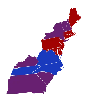 ![]() Senators' party membership by state at the opening of the 4th Congress in March 1795. Tennessee's Senators were not seated until August 2, 1796.