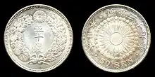 Production continued as the price of silver bullion remained steady throughout the rest of the century. This changed when silver bullion began to rise sharply in 1903 (year 36) which threatened to exceed the face value of the fifty sen coin.[28][29] It was reported by 1904 that fifty sen coins were not commonly seen in circulation.[30] An amendment to the "currency law" was promulgated as a remedy in March 1906 which lowered fifty sen coins from 30.9mm to 27.3mm, and their weight from 13.47g to 10.12 grams.[31] The third and final design used during the Meiji era on these now smaller coins is called rising sun 50 sen (旭日50銭銀貨, Asahi Nijusen), as a sunburst design on the reverse was restored.[29] The wreath design previously used on the back side of the dragon coins was adopted for the obverse.