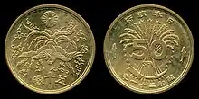 - ↑ Fifty sen coins dated 1928 to 1938 are identical to the second design minted under Emperor Taishō. The difference is that "大正" (Taishō) has been replaced with "昭和" (Shōwa).