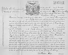 Following their muster-in at Camp Curtin in Harrisburg, Dauphin County, the members of this regiment engaged in basic training at this Union Army camp until November 8, 1861.[4][5] While stationed here, John C. Dodge, Jr., Henry M. Hoyt, and John B. Conyngham were commissioned as field and staff officers on October 7, and awarded the respective ranks of colonel, lieutenant colonel, and major. The 52nd Pennsylvania also initially had its own regimental band, a 16-piece ensemble staffed by members of the Wyoming Cornet Band from Wilkes-Barre, which was under the baton of Professor Fred Wagner. As the 52nd readied for departure, Governor Curtin presented regimental leaders with state and national flags to be carried by the regiment's color-bearer unit.[6][7]
