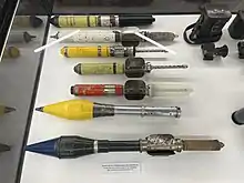 The 89 millimetre HEAT grenade weighs 2.3 kg, and is capable of penetrating 300 millimetres of RHA[2] +/- 40 millimetres. The fuse is able to function at as small as a 20 degree angle of impact.[2] The longest recommendable distance for stationary armour targets is 300 metres and to moving targets 200 metres.[2] 55 millimetre fragmentation[2] and incendiary WP grenades[4] as well as illumination rounds[4] and 55 millimetre solid training ammunition[2] were also available. The fragmentation and training ammunition weighed also 2.3 kg, and had the same 160 m/s muzzle velocity as the HEAT grenade.[2] If capped, the fragmentation grenade can penetrate obstacles such as light doors, bushes and windows before exploding. These can be shot up to 700 metres against stationary targets.[2] A rifle calibre practice barrel chambered in 7.62×54mmR could be installed inside the launching tube.