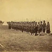 The 5th New York Veteran Infantry Regiment was an Infantry Regiment that served in the Union Army during the American Civil War. The regiment was known as "Duryée‘s Zouaves." The regiment had two uniforms during its time. The first uniform consisted of a medium blue zouave jacket with red trimming, a grey shirt, a red sash with sky blue trimming, red chasseur trousers with yellow piping, a red fez with a yellow tassel, and a white turban. The second and official uniform consisted of a dark blue zouave jacket with red trimmings in the Hawkin Zouave design, a dark blue zouave vest with red trimming, baggy red trousers, a red sash with sky blue trimming,a red fez with a yellow tassel, and a white turban.