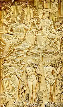 Alfred Janniot's 10-short-ton (8.9-long-ton) gilded bronze engraving above the entrance[34][35] measures 11 feet (3.4 m) wide by 18 feet (5.5 m) tall.[35][37] It contains personifications of France and New York holding hands above the ocean.[38] The personification of France holds the Notre Dame on her lap and the scroll unfurling behind is inscribed with the Latin motto of Paris: "fluctuat nec mergitur" (it floats, but never sinks).[35][37] The personification of New York sits in front of an unfurling scroll with the state's name, as well as a carving of Rockefeller Center's skyscrapers.[37] Below are three female personifications of poetry, beauty, and elegance[39][40] in varying states of dress. The engraving also contains birds, plants, and fruits.[37]