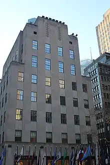 The French consulate in the building only operated until 1942 (under Vichy France), when the consular office bought a building further north on Fifth Avenue.[124] Also during the 1940s, jewelry firm J. Chaumet Inc.[125] and perfume store Coty Inc. leased space in La Maison Francaise.[126] Even during World War II, in 1944, the building was recorded as being fully occupied.[127] After the war, the building hosted a United Nations committee to identify sites for a new United Nations headquarters.[128] After World War II, Rockefeller Center sought to add air conditioning to its original structures, as this feature was already in place in newer buildings.[129][130] The British Empire Building and La Maison Francaise already had cooling systems, which were upgraded.[129] Columbia University was tasked with installing air conditioning in the buildings.[130] The onset of the Korean War in 1950 delayed the project but, by the next year, Columbia had acquiesced to reimbursing Rockefeller Center Inc. for the installation.[131]