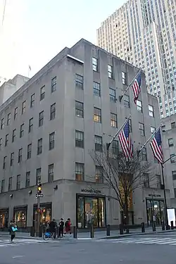 As American tenants were reluctant to rent in these retail buildings, Rockefeller Center manager Hugh Robertson, formerly of Todd, Robertson and Todd, suggested foreign tenants for the buildings.[93][94] The complex's managers promoted Rockefeller Center as a "hub for international trade".[9] Rockefeller Center's managers held talks with prospective Czech, German, Italian, and Swedish lessees who could potentially occupy the six-story internationally themed buildings on Fifth Avenue. Dutch, Chinese, Japanese, and Russian tenants were also reportedly considered.[88][93][94] The British government had agreed to occupy the British Empire Building in January 1932, making it the first themed building for which an agreement was made.[86][95] The second themed building was La Maison Francaise, which French tenants agreed to occupy in March 1932.[22][23] Unlike for the British building, for which the British government was a tenant,[95] the French government was not originally planned to be a tenant.[96] Like the British building, La Maison Francaise was to be a free port, with all of its merchandise being exempted from tariffs.[9] The seventh-story penthouse above the building was added late in the design process.[24]