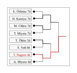 • The age breakdown (age at start of the tournament) for the players who qualified was as follows: 10–19 years old, 2 players; 20–29 years old, 15 players; 30–39 years old, 14 players; 40–49 years old, 17 players; 50–59 years old, 1 player; 60 years old or older, 1 player. The oldest player was Keiji Mori 9d (64 years old) and the youngest players were Tatsuya Sugai 4d and Takuya Nagase 4d (both 18 years old).[lower-alpha 11]