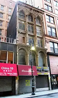 63 Nassau Street is a landmark building located on Nassau Street between Fulton and John Streets in the Financial District of Manhattan, New York City. It was built in the Italianate style c.1844, and had its cast-iron facade, attributed to James Bogardus, added in 1857-59, making it one of the first cast-iron buildings in the city. The attribution to Bogardus, a pioneer in the architectural use of cast iron, comes because of medallions of Benjamin Franklin identical to those on four other Bogardus projects, all now demolished. George Washington was also once represented with medallions.[1][2]