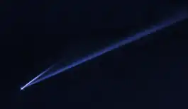 On January 5, 2019, it was discovered that Gault possesses a comet tail, which had not been present in previous images taken during the 2018/19 opposition.[13][9] The asteroid began to break up as its spin accelerated due to the YORP effect, and its rotation speed approached two hours – near the limit of stability for an asteroid. The ejected matter created two dust tails,[14] and the longer one has been estimated at over 800,000 km (500,000 mi) long. Earlier hypotheses of a collision with another asteroid were ruled out as a source of the tail-forming dust, and its two tails were believed to be a result of sudden dust ejections near October 28 and December 30, 2018.[9] It is also possible that solar heating caused sublimation of ice, perhaps beneath the surface in a "pocket," and the force of the ejection of material (after being exposed to solar heating during the rotation of the asteroid) resulted in the spin rate increase. A prior example of such an occurrence is in the literature.[15]