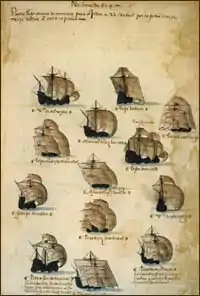 The 6th Armada was composed of 13 ships: approximately nine large nau or carracks, plus four small navetas (caravels) and 1200 men. The exact composition of the fleet differs in the various accounts.