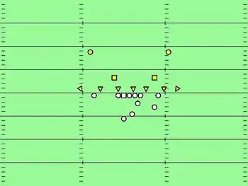 The 7–2–2 defense or seven-box defense, used seven "down linemen", or players on the line of scrimmage at the time of the snap, two linebackers, and two safeties.[1] Amos Alonzo Stagg invented the seven-box defense in 1890 at Springfield College.[2] At that time, most teams were using a nine-man line on defense, and there were only three downs and no forward passes.[3] The 7–2–2 was the base defense used by Knute Rockne at Notre Dame,[4] as well as Mike Donahue at Auburn. Into the late 1930s, the 7–2–2 was still commonly employed inside the defender's thirty-yard line. It was considered "very strong against a running attack, but rather weak defensively against passes."[5] The 7–2–2 was also employed when the opponent was expected to punt.[6]