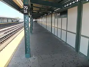 79th Street station opened on June 24, 1916 along with the first portion of the BMT West End Line from 36th Street on the BMT Fourth Avenue Line to 18th Avenue station.[3][4] The line was originally a surface excursion railway to Coney Island, called the Brooklyn, Bath and Coney Island Railroad, which was established in 1862, but did not reach Coney Island until 1864.[5] Under the Dual Contracts of 1913, an elevated line was built over New Utrecht Avenue, 86th Street and Stillwell Avenue. The section of the West End Line between 62nd Street and 18th Avenue originally opened with only one track in service. The second track between 62nd Street and 18th Avenue opened on July 8, 1916.[6]