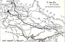 The 7th Landwehr Division (7. Landwehr-Division) was a unit of the Prussian/German Army.[1] The division was formed on January 27, 1915, out of two formerly Mixed Landwehr Brigades (55th and the 57th). The division spent the period from its formation to early 1917 on the Western Front, mainly involved in positional warfare in Upper Alsace, after which it went to the Lorraine front. It was transferred to the Eastern Front in the Spring of 1917, where it remained after the 1917 armistice on that front. In 1918, it served on internal security missions in Ukraine, where it was located when World War I ended. Allied intelligence rated the division as a fourth class division.[2][3] The division was disbanded in 1919, during the demobilization of the German Army after World War I.